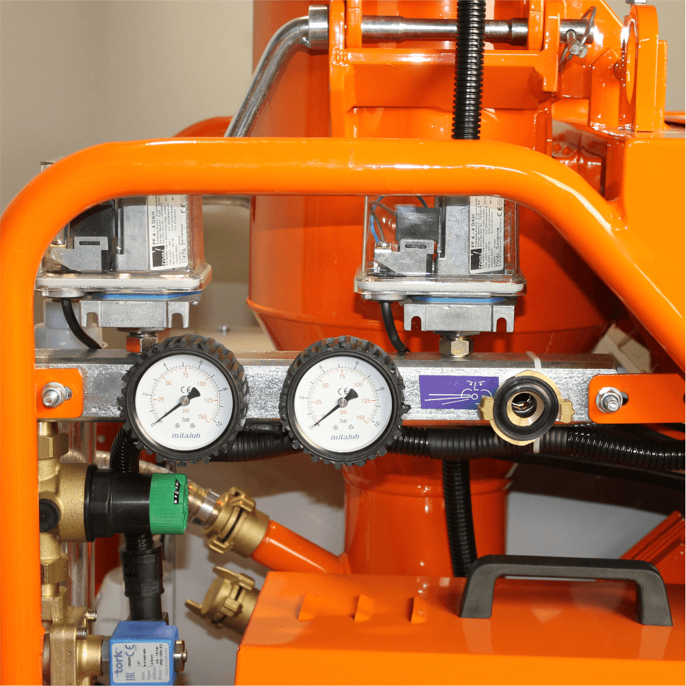 - Pregătește materialul prăfos (pe bază de gips, var sau ciment ori alte materiale compatibile) pentru amestecare și pulverizare continuă.